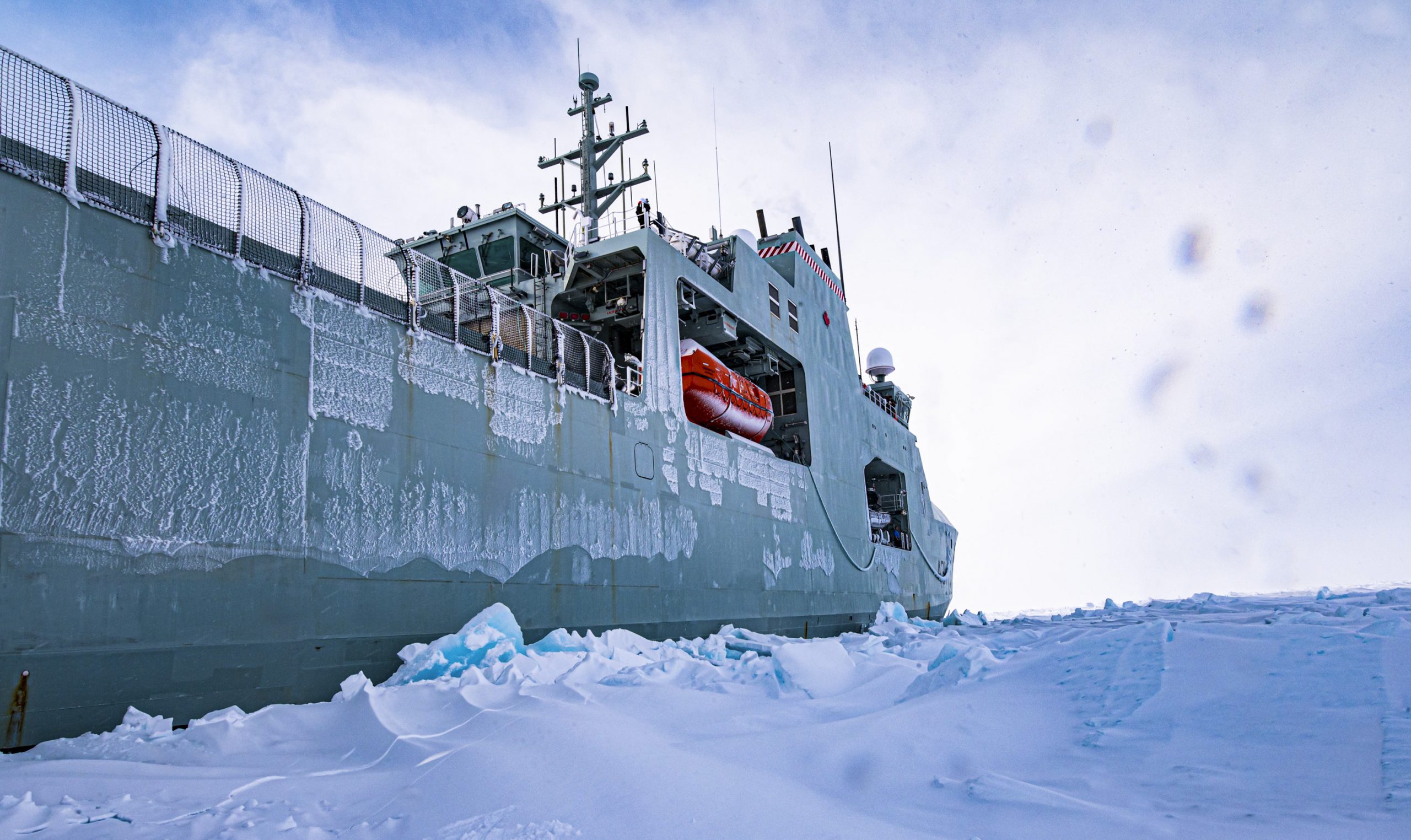 Image: HMCS MARGARET BROOKE parked in ice for as they prepare to take samples of the ice conducted by civilian contractors in the Labrador sea during ice trials on February 27th 2022. Credit: S2 Taylor Congdon, Canadian Armed Forces Photo